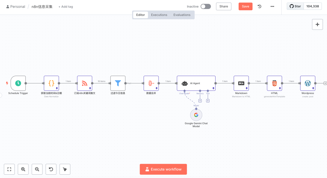 该工作流可以做到每天早上8点定时启动采集 RSS / 自定义来源的文章或灵感草稿,自动整理与分类归纳,AI 智能清洗润色文案(人工整理审核)。