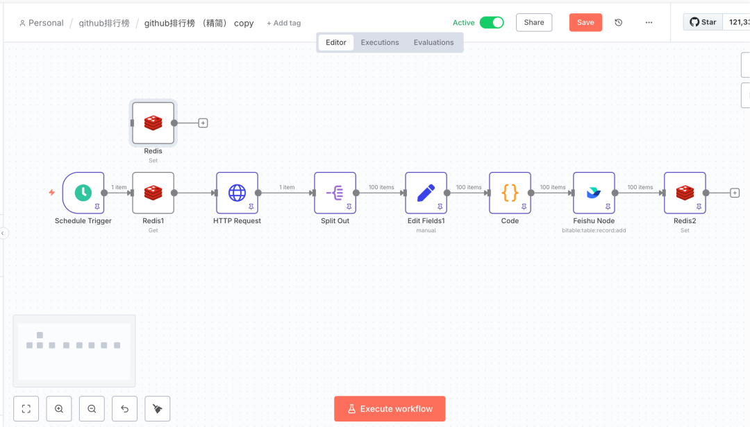 使用 n8n 构建自动化流程,分页抓取 GitHub 上 star 超过 5000 的开源项目数据,自动写入飞书多维表格,可用于榜单生成、技术雷达、内容推荐等场景,支持动态区间更新与断点续跑。