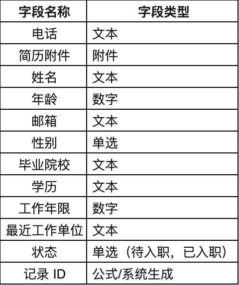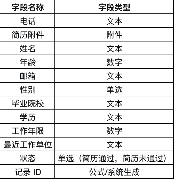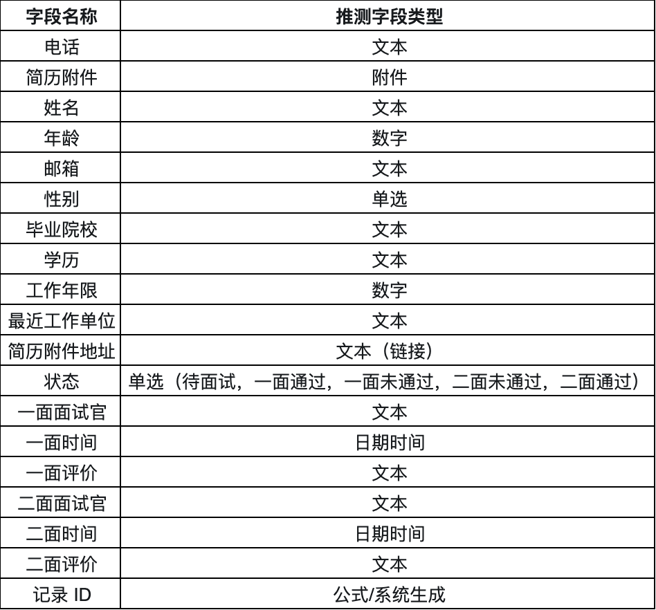 简历表主要用于管理面试流程,包括状态字段:待面试、一面通过、一面未通过、二面通过、二面未通过。