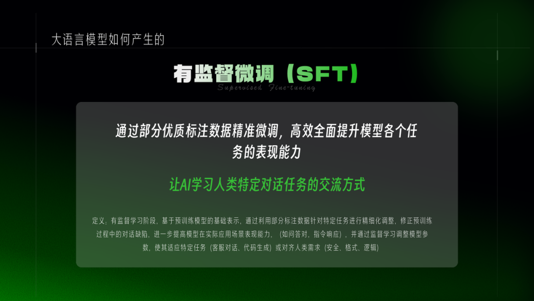 有监督微调通过高质量的一些特定的数据进行精细微调