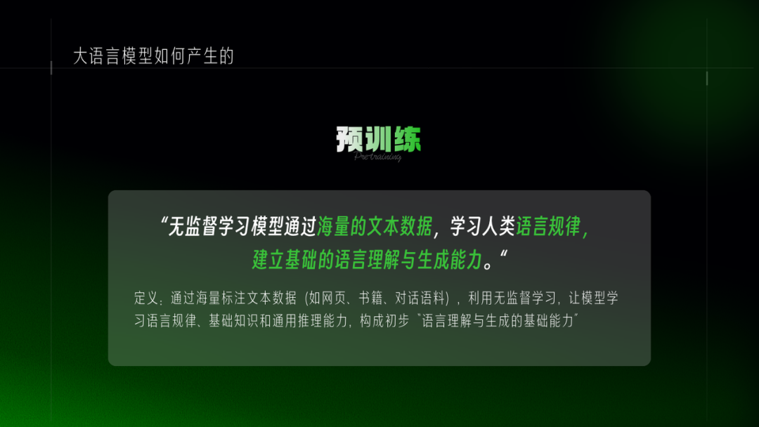 预训练模型这个阶段,我们可以理解为无监督学习是通过大量数据和文本内容,让模型学习人类语言规律,建立基础语言理解和生成能力。称为大语言模型。