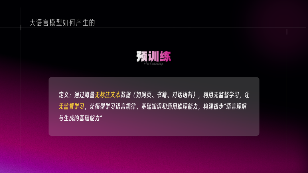 让他自己学习里面有什么样的内容,让模型学习了解人类语言的基础规律,学习之后会构建一个初步语言理解和基础表达能力。