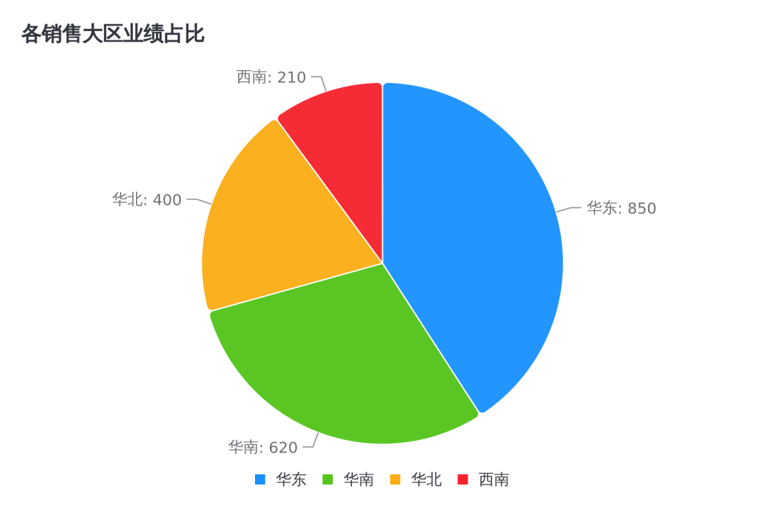 生成一个饼图,展示各个销售大区的业绩占比:华东 (850万),华南 (620万),华北 (400万),西南 (210万)。
