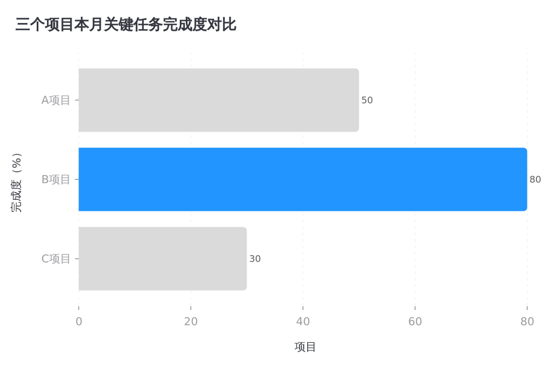 我需要一个条形图,对比A、B、C三个项目的本月关键任务完成度。A项目 (50%),B项目 (80%),C项目 (30%)。请把B项目用蓝色高亮显示。