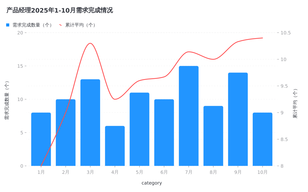 请使用AntV(例如G2Plot)生成一个图表,用于展示“产品经理2025年需求完成情况”。1.图表类型:柱状图和折线图的组合图表(混合图表)。使用柱状图来表示每个月的“需求完成数量”。在同一图表上,使用折线图来连接数据点,以显示“完成趋势”。2.业务场景:统计产品经理从2025年1月到2025年10月,每月所完成的需求数量。3.图表数据:请按以下时序排列数据:2025年1月:82025年2月:102025年3月:132025年4月:62025年5月:112025年6月:102025年7月:152025年8月:92025年9月:142025年10月:84.图表配置要求:X轴(分类轴):”月份”(从1月到10月)。Y轴(数值轴):”需求完成数量”。图表标题(建议):”2025年1-10月产品需求完成情况”图例:清晰展示柱状图和折线图分别代表的含义(例如:“完成数量”和“趋势”)。请根据以上信息生成图表。