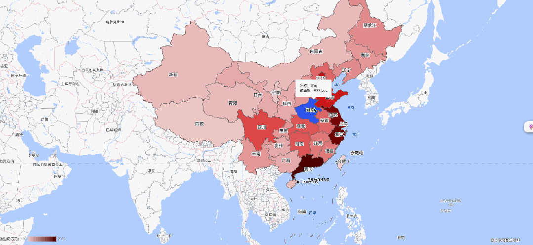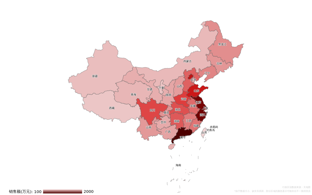 我需要一张中国地图,用来展示不同省区的销售额。请用不同深浅的颜色来表示销售额高低。将销售额最高的三个省份:广东(2000万), 浙江(1800万), 江苏(1750万)用「红色」(#FF0000) 突出显示。其他省份数据:山东(1200万), 河南(900万), 四川(850万), …