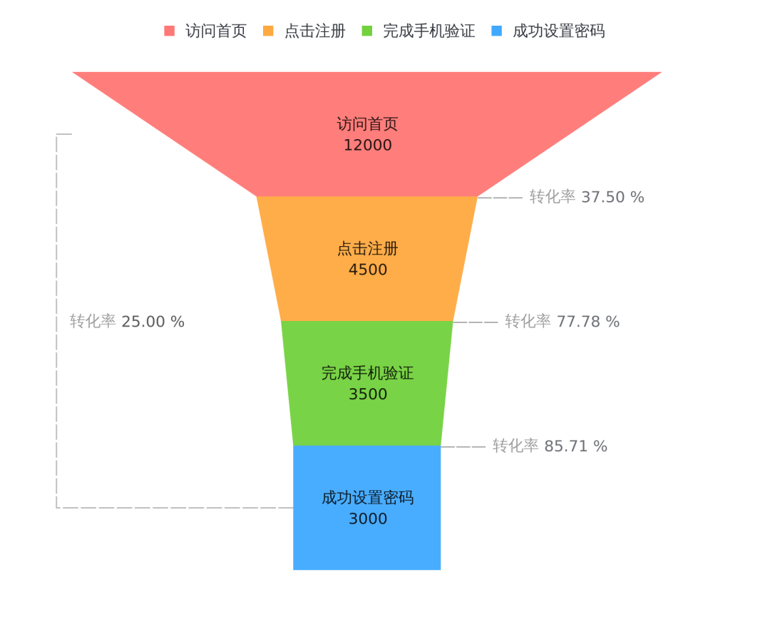 帮我创建一个漏斗图,显示新用户注册流程的转化:访问首页 (12000人),点击注册 (4500人),完成手机验证 (3500人),成功设置密码 (3000人)。