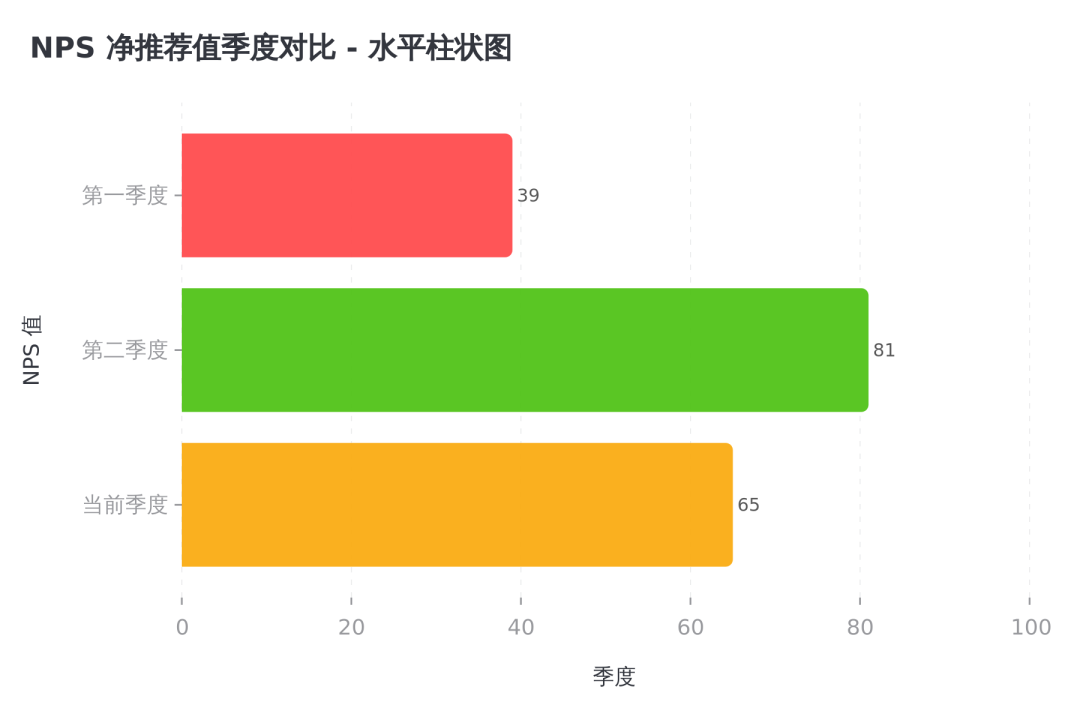 我需要一个NPS仪表盘图,显示我们这季度的净推荐值为 65。(请使用三色分段:0-50为红色, 51-80为黄色, 81-100为绿色)