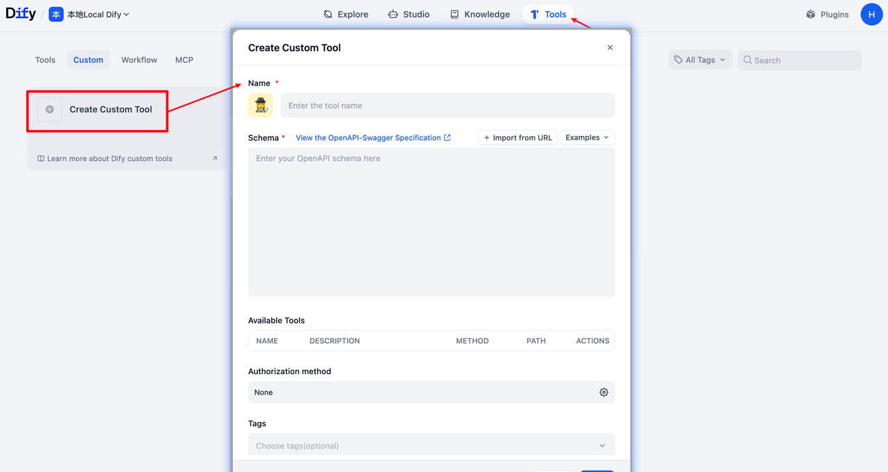 Dify Console -> Tools -> Custom -> Create Custom Tool