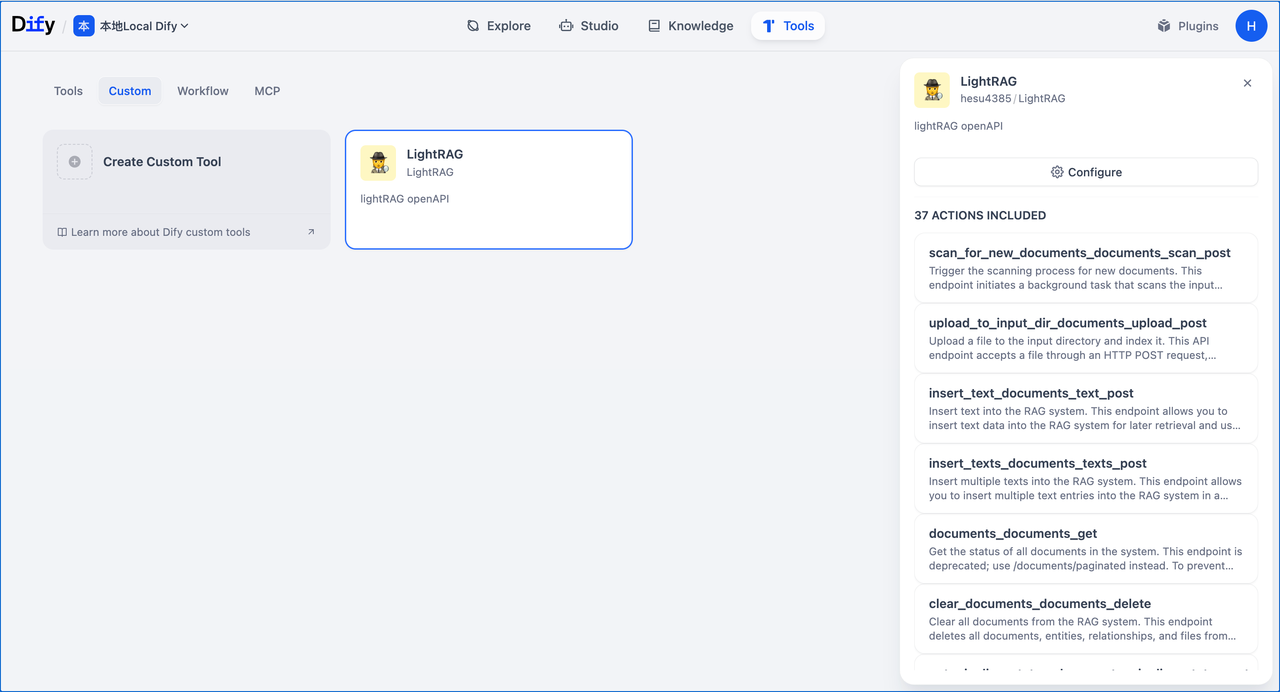 填入符合OpenAPI-Swagger规范的Schema,直接可以获取LightRAG提供的全部API工具