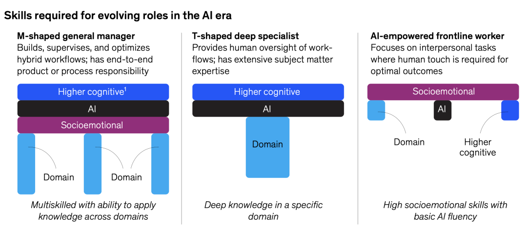 麦肯锡提出三类新型人才:M型的通才管理者(会整合与编排AI)、T型的专家(懂业务也懂AI),以及AI赋能的一线员工(在AI支持下专注人际价值)。