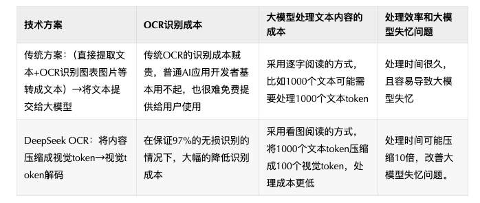 以下通过一张表清晰的对比为了解决文档识别的应用场景问题,传统的技术方案和DeepSeek-OCR方式的差异: