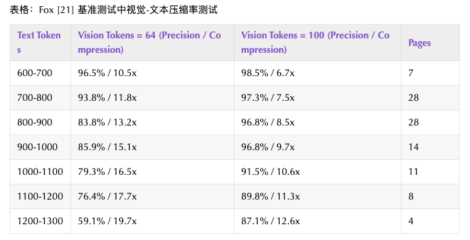 • 对于包含900-1000个文本token的页面(约9.7倍压缩),模型精度依然保持在96.8%。