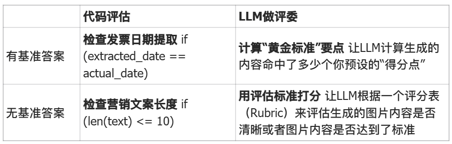 LLM即评委(Subjective):输出是主观的(如文案质量、图表清晰度),需要模型来打分。