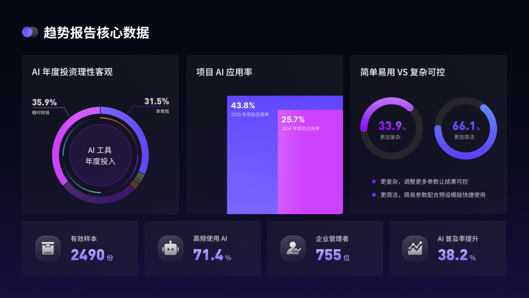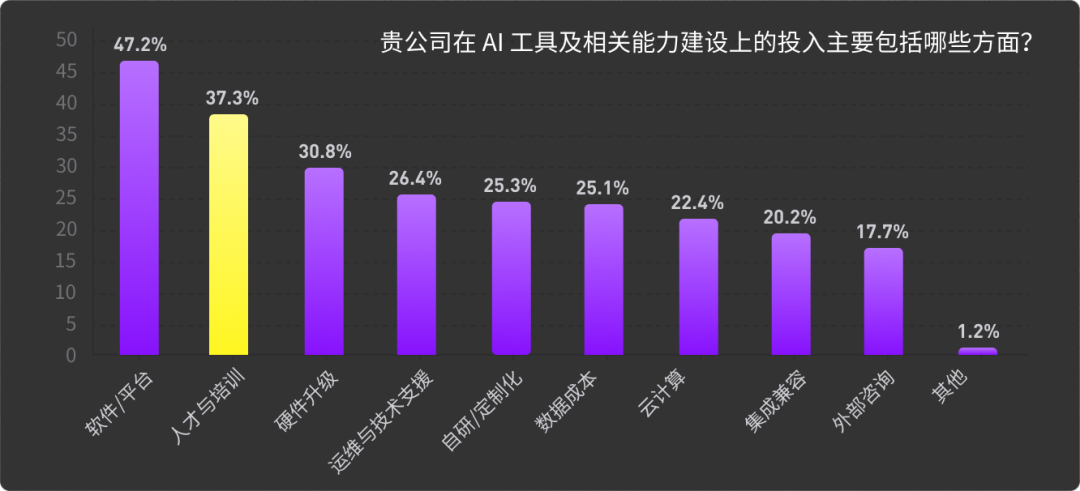 - 管理者在AI投入上同时聚焦人才和工具。在AI工具和相关能力的建设上,“软件和平台费用”(47.2%)“人才和培训”(37.3%)重要性显著超过了“硬件升级”(30.8%)“日常运维与技术支持”(26.4%)等其他支出项。