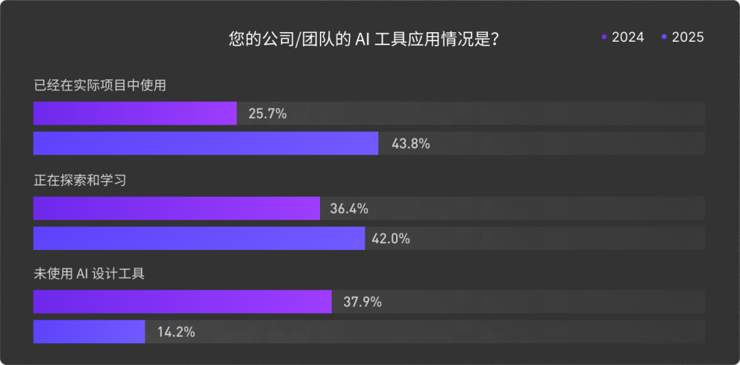 2025 年的调研数据显示,AI 在设计行业的使用率达到 85.8%,其中 43.8% 的受访者表示已经在项目中使用 AI 辅助设计,42% 的受访者正在探索和练习 AI,仅有 14.2% 的受访者未使用任何 AI 工具。