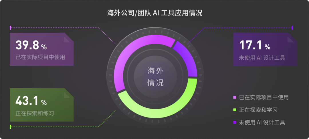 放眼全球,这一趋势同样得到印证。82.8% 的海外设计师正在项目中应用 AI 或正在探索如何在项目中落地 AI,仅有 17.1% 的海外受访者未使用任何 AI 工具,整体的 AI 使用情况分布与国内基本一致。