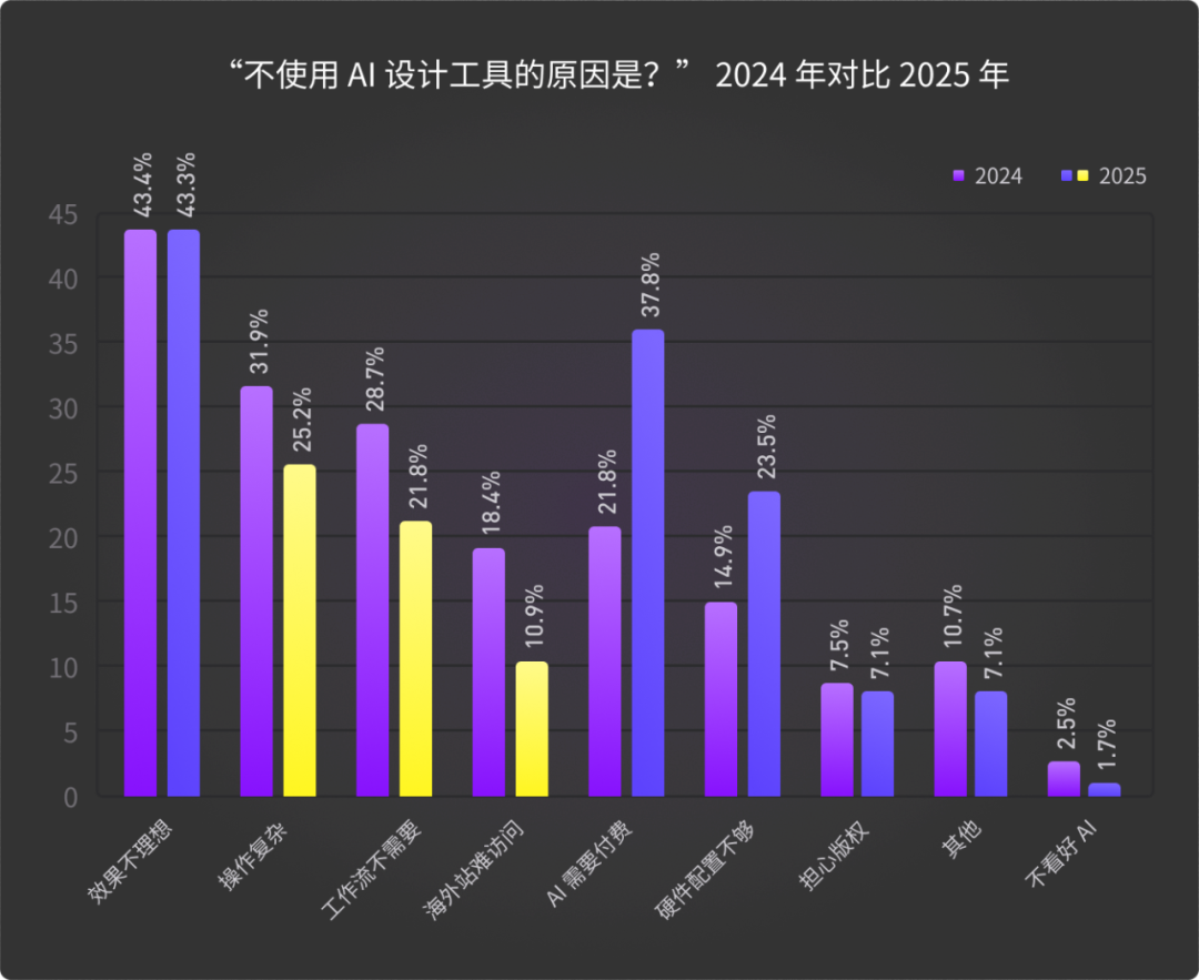 数据显示,因“AI 需要付费”而放弃使用的国内设计师比例从 2024 年的 21.8% 跃升至 37.8%,成为 2025 年的第二大原因。同时,“硬件配置不够”的比例也从 14.9% 提升至 23.5%。