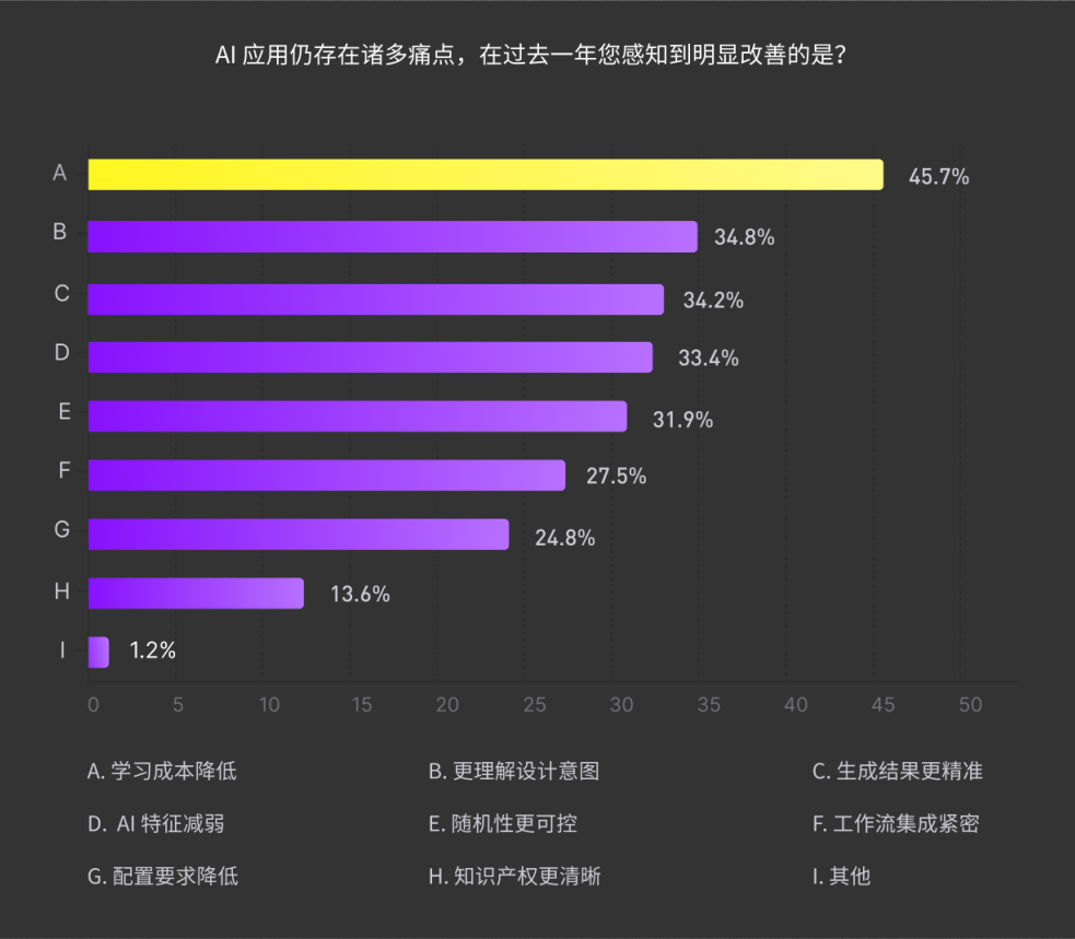 另一组数据更有说服力。在过去一年中,AI 工具的使用痛点都有不同程度优化,其中受访者感知最明显的是“学习成本降低,操作更加友好”(45.7%),比例远超其他任何改进项。