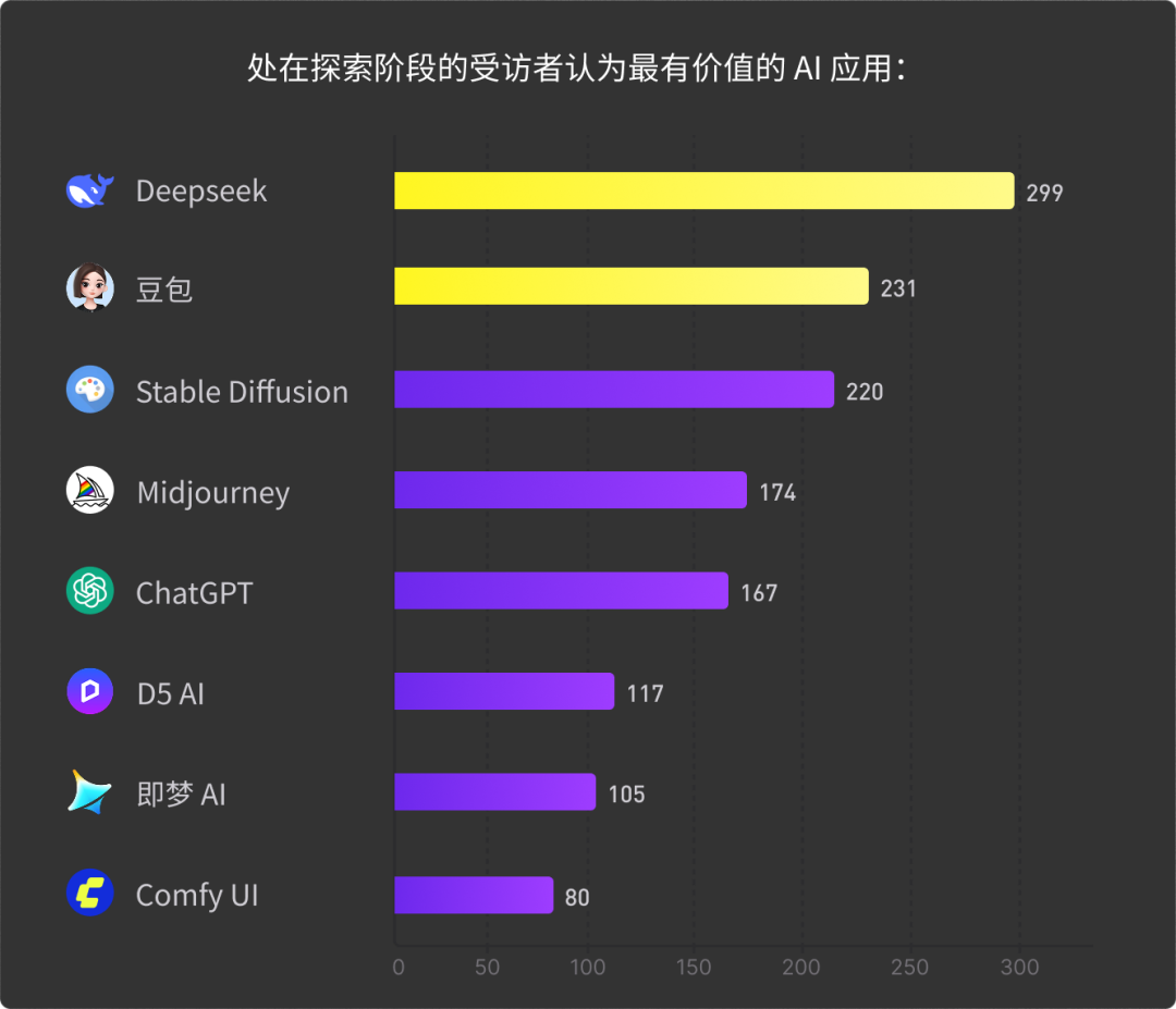在 AI 应用的选择上,设计师群体呈现出明显的分层现象,其偏好与在工作流中应用 AI 的深度紧密相关。当被问到哪些 AI 帮助最大,处在探索期的 AI 入门者,更倾向于通用型 AI 应用,低门槛获取、自然语言交互以及广泛的社会影响力,成为了许多设计师初次接触 AI 的窗口。