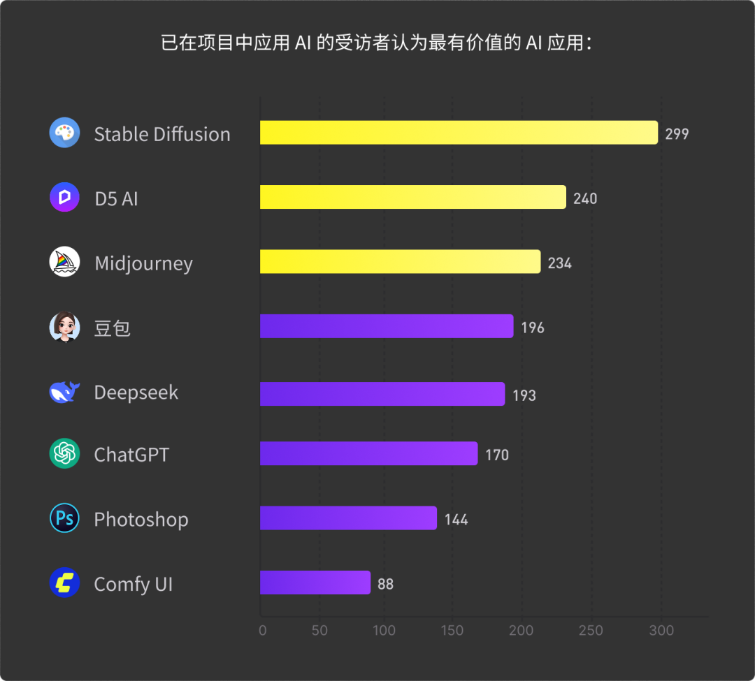 而已在项目中应用 AI 的受访者,则会更倾向于 Stable Diffusion、D5 AI、Midjourney 这类专业垂直应用。从入门到精通的过程中,设计师的需求从泛化的信息辅助,向能切实提升项目交付质量和效率的专业生产工具转变。