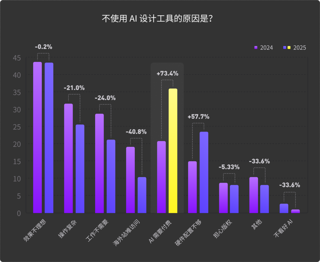 另一个 2025 年显著的变化是,阻碍设计师使用 AI 的原因正从技术性壁垒转向经济性壁垒。与 2024 年相比,“操作复杂”“海外站点访问困难”等技术性问题已不再是主要障碍。如今,成本成为更突出的考量因素。