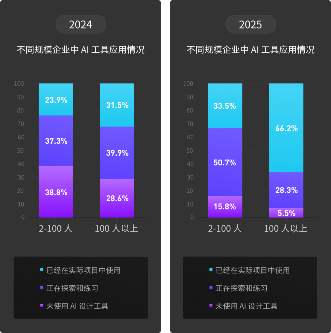 AI 在设计企业的渗透并非均衡分布,而是呈现出一种与企业规模紧密相关的分化趋势。大型设计企业在 AI 技术的采用率和整合深度上,均显著领先于中小型事务所。