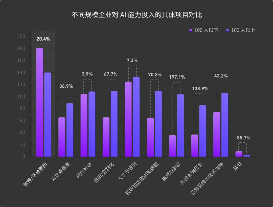 在受访企业关于 AI 的所有相关支出中,中小型企业仅有一项支出在占比上领先于大型企业,即“软件/平台费用”。它们能够战略性地“绕过”自建基础设施和研发团队的高成本探索期,直接采用市面上灵活、低成本的订阅式(SaaS)AI 工具,将有限的资本精准投向能直接创造商业价值的应用环节,以保持其市场竞争力。
