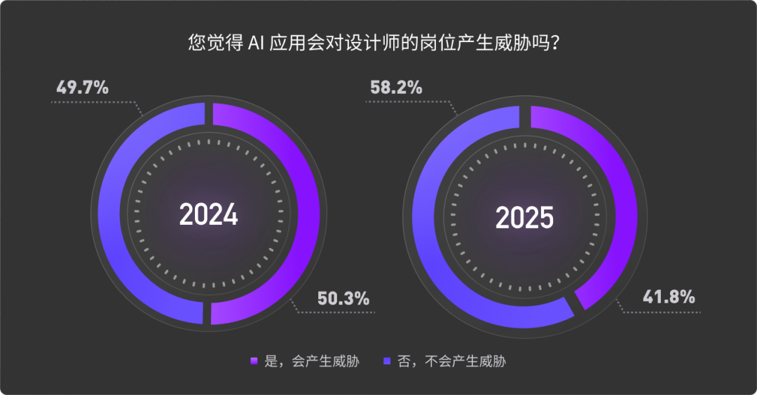 “AI 是否会取代设计师?”自这一波 AI 浪潮兴起的伊始,这就是一个被不断被提及的问题,行业内部对此充满了复杂的情绪。2024 年的调研数据中,持正反观点的受访者几乎各占 50%。而到了 2025 年,认为 AI 不会威胁设计师岗位的观点占据了主导,占比达到 58.2%,主流从业者态度转向乐观。