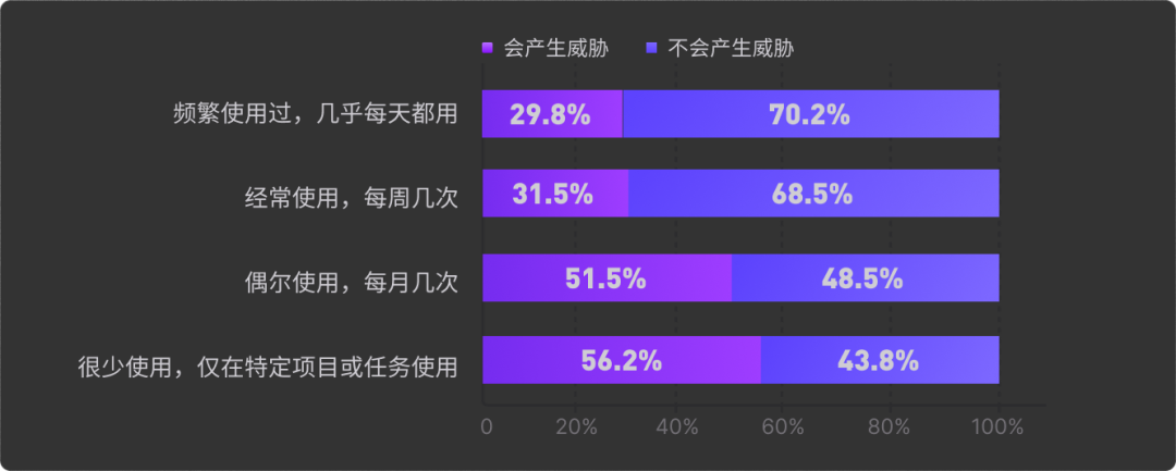 结合 AI 项目渗透率和 AI 工具使用频率两个核心数据来分析,我们发现设计师对 AI 的“恐惧感”很大程度上源于“距离感”。调研数据显示,设计师对 AI 的岗位威胁感知与其 AI 工具的使用频率呈现出明显的负相关。简言之, AI 工具用得越频繁的设计师,越不认为 AI 会对自己的岗位产生威胁。在“频繁使用(每天都用)”的受访者中,将 AI 视为威胁的比例仅为 29.8%,形成鲜明对比的是,这一比例在“很少使用”的受访者群体中达到 56.2% 的峰值。