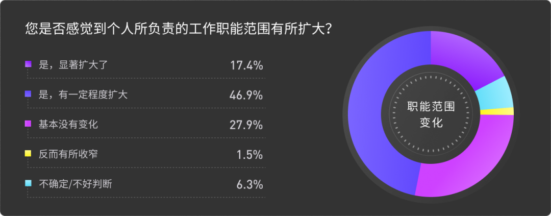 从具体的任务操作层面,64.3% 的设计师直观地感受到了个人工作职能的延伸,其中 46.9% 认为有一定程度扩大,17.4% 认为显著扩大。