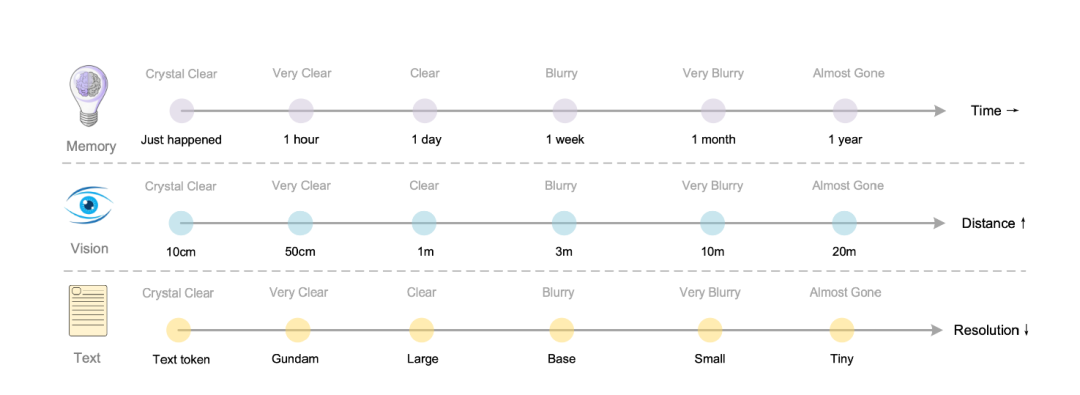 DeepSeek的研究人员注意到,当他们把信息压缩比提高到20倍的时候,长文本在低分辨率下会变得模糊,识别精度会下降。但他们没把这个现象当成一个bug,反而从中看到了一个更深层的逻辑——这不就是人类记忆的遗忘机制吗?
