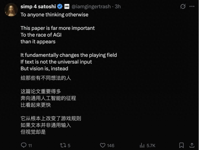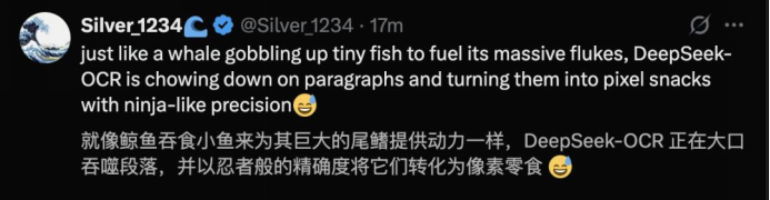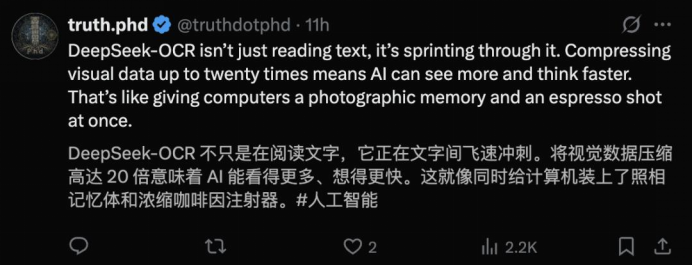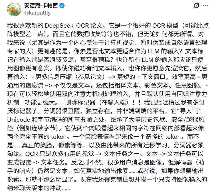 DeepSeek-OCR压缩10倍,还原率是96.5%;压缩20倍,还原率还保持60%左右,效率大幅提升,能耗大幅减少。前特斯拉总监Karpathy对DeepSeek-OCR高度赞赏,认为它可能预示着“文本输入终将让位于像素输入“。