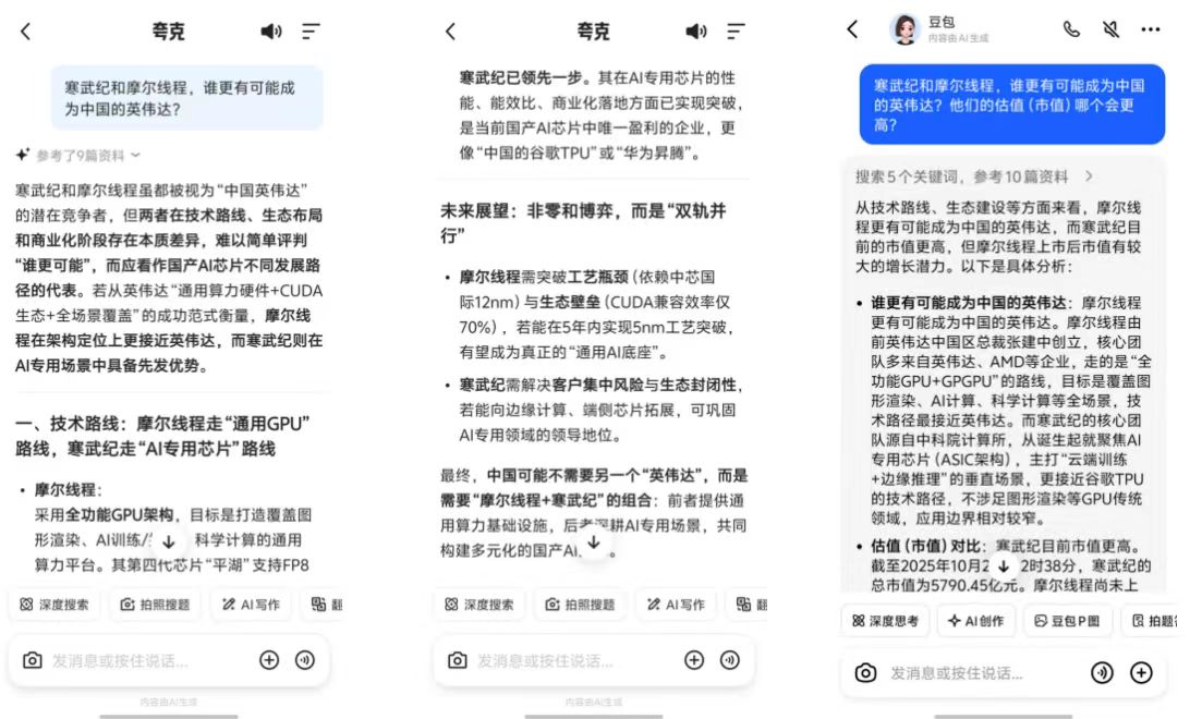 我问豆包和夸克对话助手“寒武纪跟摩尔线程,谁更有可能成为中国的英伟达,它们的估值(市值)哪个会更高?”,前者给出了约400字的概要性回答,后者则给了约1400字的详细分析,在开头给出“核心结论”后,还给出了体系化论证链条。
