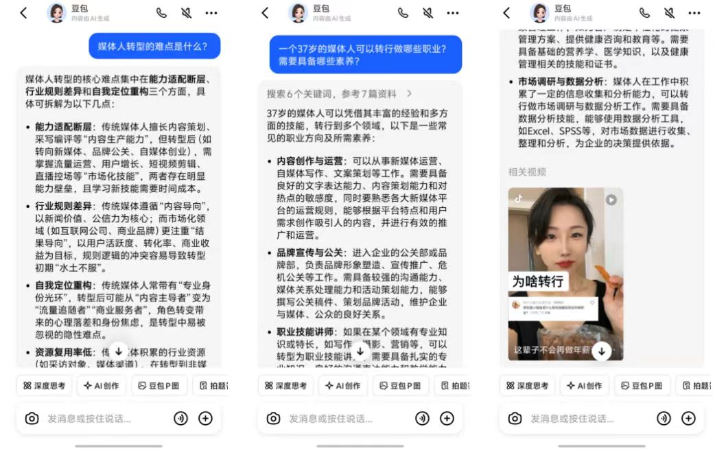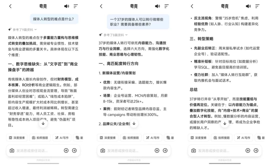 我问豆包跟夸克对话助手“媒体人转型的难点是什么”,接着又追问“37岁媒体人可以转行做哪些职业,需要具备哪些素养?”豆包给出的转型选项相对“普适”,对所需素养也讲得较泛;夸克则能抓住“37岁”这点,从高匹配度转行方向、核心素养要求、转型策略三个维度展开了回答,还能提供可参考路径案例、具体技能要求等。