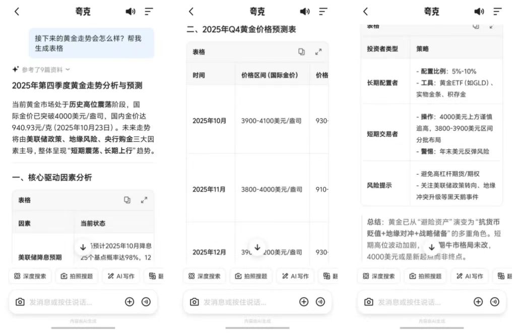 而夸克对话助手面临复杂任务时,表现更丝滑:我问它“接下来黄金走势会怎么样?帮我生成表格说明”,它会自动完成“调用搜索获取最新数据-启动数据分析模块处理数据-调用图表生成工具创建表格-整合结果输出”的全流程。