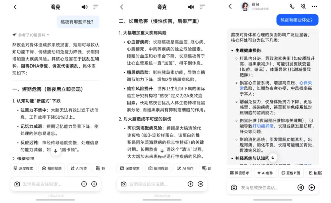 我问豆包跟夸克对话助手“熬夜有哪些坏处?”豆包比较简洁笼统地谈到了“生理健康损害”“神经系统与认知问题”“其他隐性危害”,夸克对话助手则分为短期危害、长期危害、如何减少熬夜伤害三块作答,一并给出的还有生物学依据、医学原理与外部症状等。
