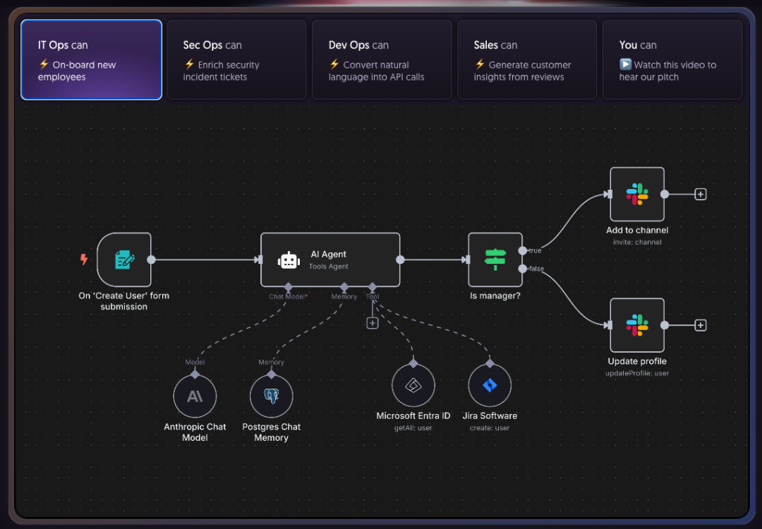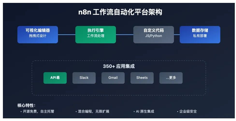 在这一层,n8n 的角色与价值被迅速放大。它并不生产模型,而是提供一个开放的自动化与编排框架,使 AI 能够在企业内部系统中真正落地。