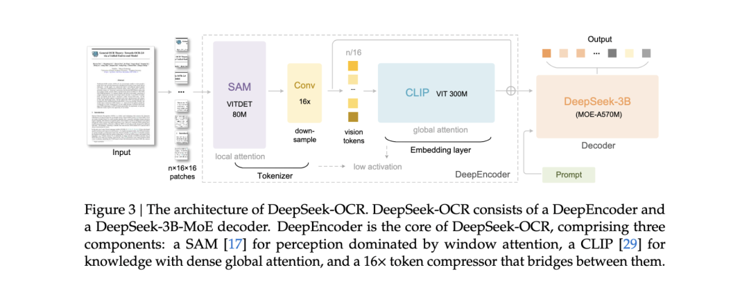 DeepSeek-OCR 模型架构。图源:https://github.com/deepseek-ai/DeepSeek-OCR/blob/main/DeepSeek_OCR_paper.pdf