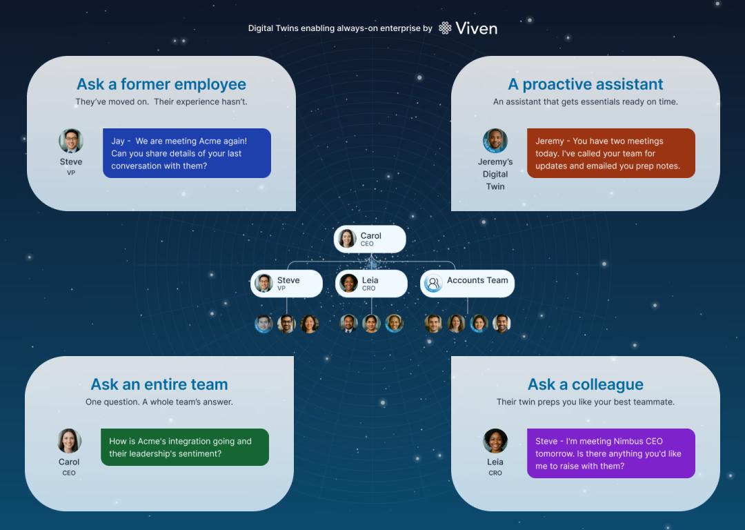 我特别欣赏 Viven 的一点是,它不仅仅为个人创建数字分身,还可以为整个团队创建集体分身。想象一下,CEO 可以查询一个跨越销售、工程、产品管理和支持团队的全球客户团队的分身,在重要会议前获得全面的客户更新。这种能力让组织的全部深度变得即时可访问,打破了部门之间的信息孤岛。