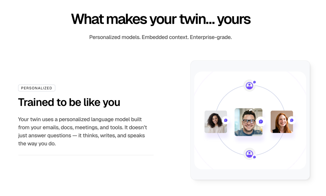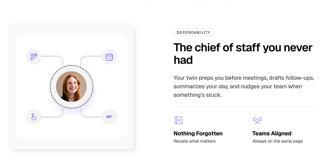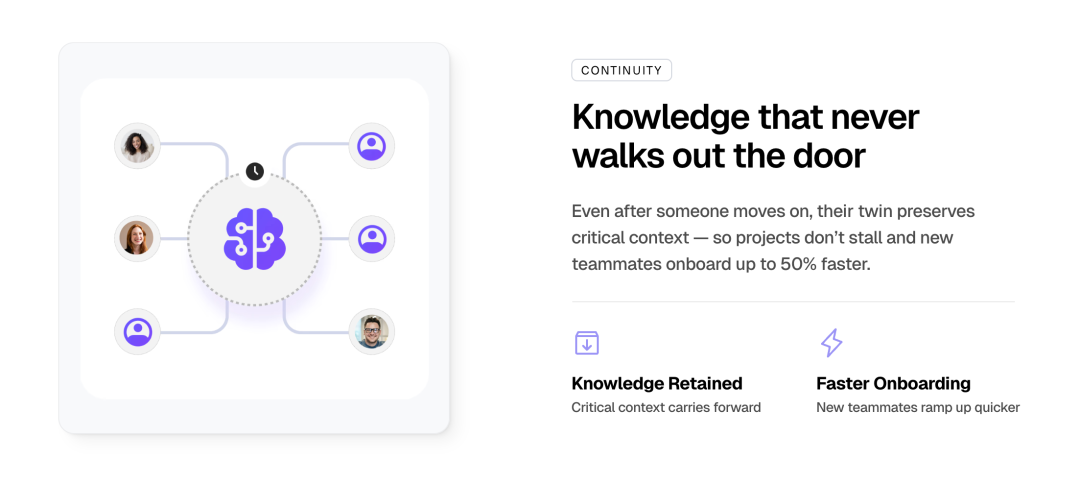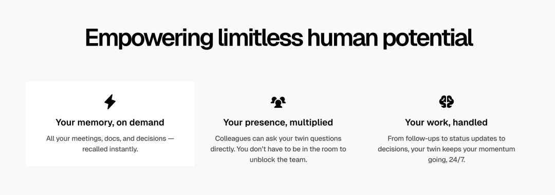 当其他员工需要信息时,他们可以直接向这个人的数字分身提问,就像和真人对话一样。数字分身会基于它学习到的知识给出答案,提供背景信息,甚至解释当初为什么做出某个决策。Ashutosh Garg 在接受 TechCrunch 采访时说:”当每个人都有数字分身时,你可以直接和他们的分身对话,就像在和真人交谈一样,然后得到回应。”