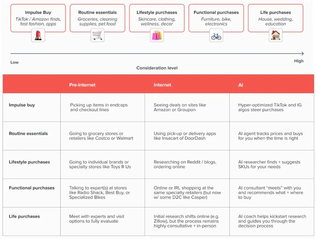 Freda 在她的分析中引用了 a16z 合伙人 Alex Rampell 的框架,将消费分为三大类:冲动购买(Impulse Buys)、日常必需品(Routine Essentials)和重大人生购买(Life Purchases)。这个分类看似简单,但却直击 agentic commerce 的核心问题:AI agent 到底适合处理哪类购物场景?我认为这是一个被严重低估的关键问题。很多人在讨论 AI agent 购物时,都假设它可以处理所有类型的购买,但实际上不同类别的购买有着截然不同的决策逻辑和信任要求。(可以看之前的文章《a16z最新洞察|传统电商已死?AI原生平台正在重新定义”购物”这件事》)