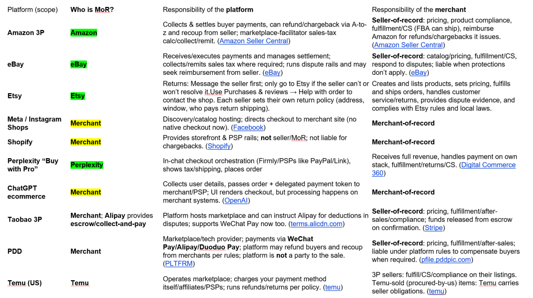 中间地带更有意思。Etsy 和 eBay 是平台作为 MoR(集中支付),但在退货方面,买家首先联系卖家,如果 2-3 天内没有回应,平台才介入。淘宝和拼多多则是商家作为 MoR,但平台高度参与,提供托管服务和支付代收,并调解纠纷。我认为这些中间模式其实代表了不同市场环境下的妥协方案,它们试图在控制力和灵活性之间找到平衡点。