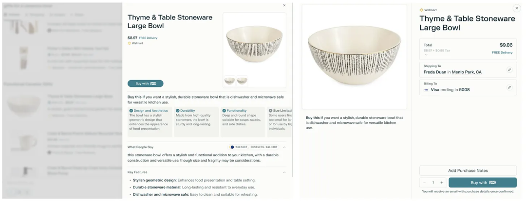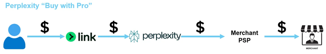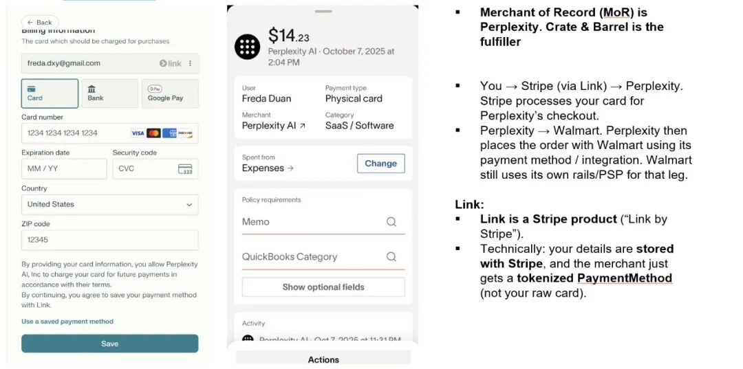 相比之下,Perplexity 选择了一条更艰难的路。在 “Buy with Pro” 中,Perplexity 充当 MoR,而 Walmart(商家)只是履行者。这意味着 Perplexity 承担了比 OpenAI 多得多的责任。流程是:资金先通过 Perplexity,Stripe(通过 Link)为 Perplexity 的结账处理你的信用卡,然后 Perplexity 使用 Walmart 的 PSP 向 Walmart 下单。对商家来说,如果你关心拥有支付、税务、退款、欺诈、CRM 和第一方数据的所有权,同时仍然获得 agentic 分发,那么 ACP 更好。对平台来说,ChatGPT 的方法更容易扩展,因为它几乎不承担任何责任。