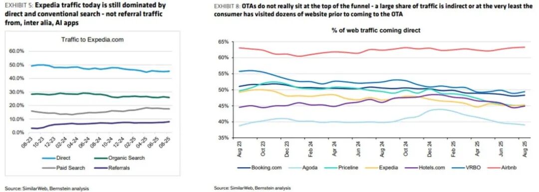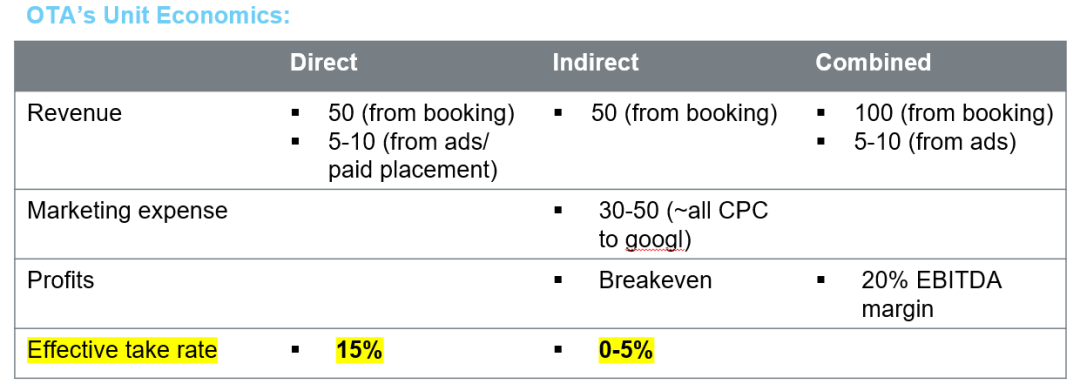 让我们先看 Booking 和 Expedia 的现状。这两家全球最大的在线旅游平台,大约一半的预订和流量是直接的,另一半是间接的(主要通过 Google)。表面上看,这似乎是一个健康的平衡。但当你深入研究单位经济效益时,会发现一个残酷的真相:对于间接流量部分,这些公司基本上只是收支平衡,因为他们向 Google 支付的每次点击成本(CPC)非常高。