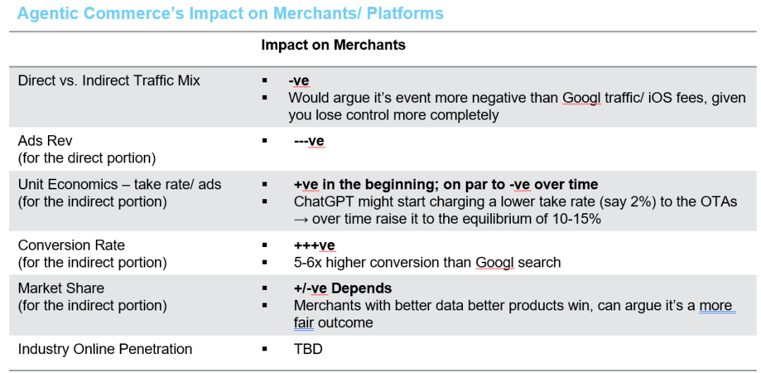 还可以注意到很多卖方分析师在预测,agentic commerce 的采用将提高行业的在线渗透率。他们的逻辑是:更便捷的购物体验会吸引更多人在线购物。但我对这个逻辑持保留态度。在线渗透率的提高通常受限于产品特性(某些商品必须线下体验)和人口结构(老年人的数字化程度),而不是购物流程的便捷性。agentic commerce 更可能是重新分配现有在线市场的份额,而不是显著扩大整个市场。
