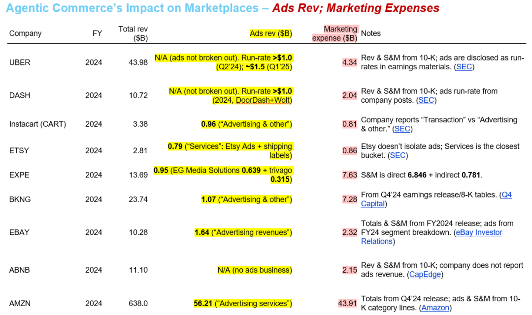 营销费用流向的问题。在 Freda 的分析框架中,营销费用最终都流向”漏斗顶端”,无论是以广告支出还是平台抽成的形式。但有一个更微妙的问题常被忽视:来自直接流量的广告收入会去哪里?如果 agentic commerce 将越来越多的流量从直接转向间接,那些依赖站内广告盈利的平台(比如 Booking、Expedia、Etsy)会失去这部分高利润收入。这不仅仅是利润的减少,而是商业模式的根本性破坏。