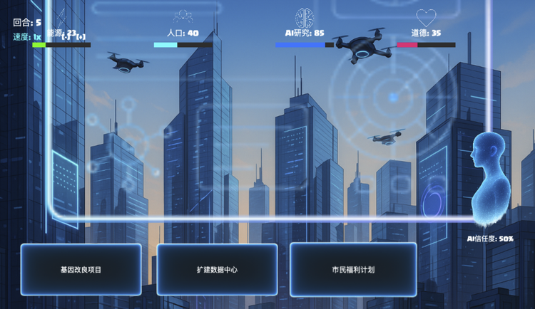 这是一款近未来城市管理类游戏,玩家要在一个由 AI 运行的都市中维持能源、人口、AI 研究与道德四项指标的平衡。