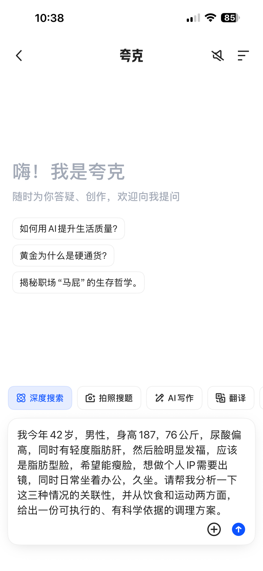 我也问了GPT,老实说,给的答案不大满意。正好夸克的朋友和我说,他们10月23日刚上线了“对话助手”。我之前参加过他们的活动,知道夸克在“健康大模型”上积累很深,这次又有“Qwen最新闭源模型”支撑,于是决定,把我这个“要命”的复杂问题,扔给它试试!