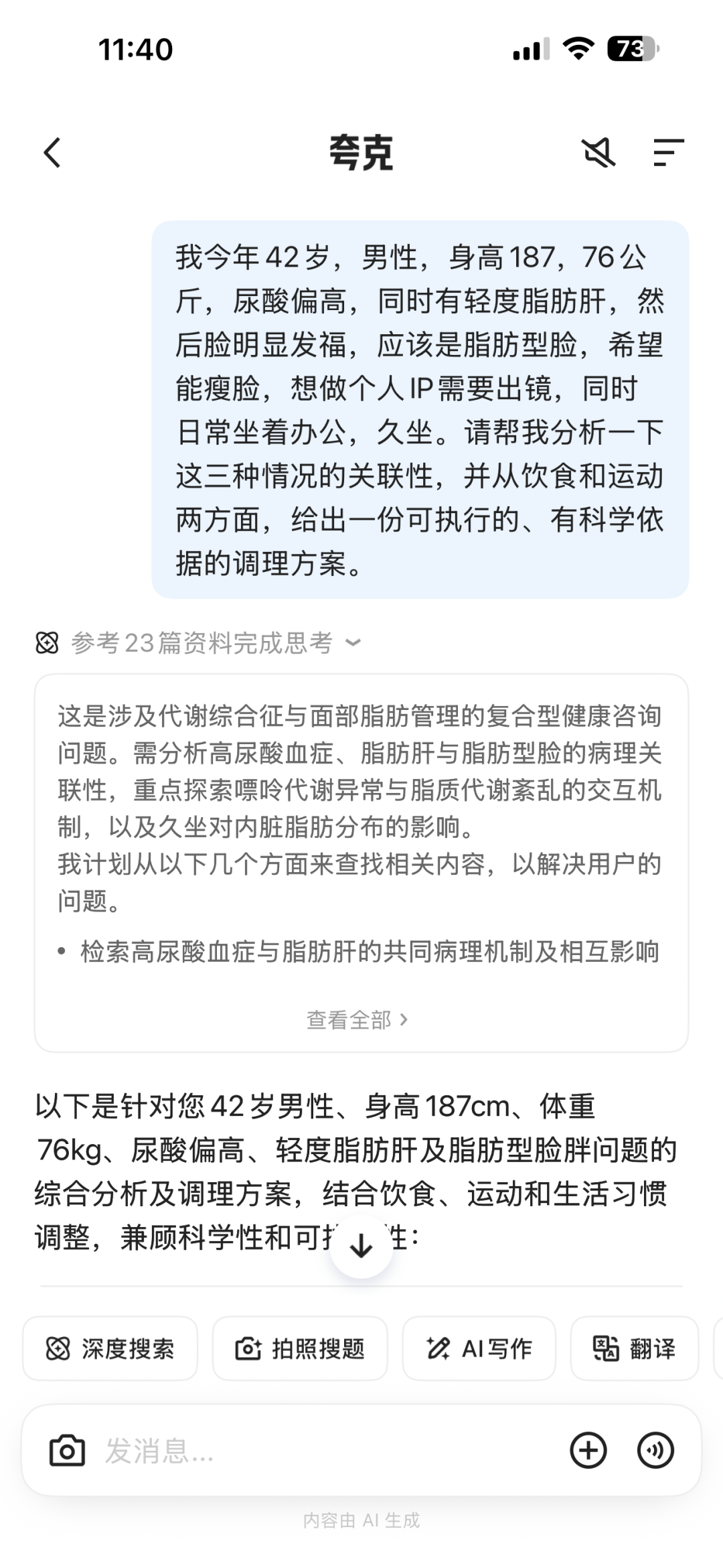 Prompt: “我今年42岁,男性,身高187,76公斤,尿酸偏高,同时有轻度脂肪肝,然后脸明显发福,应该是脂肪型脸,希望能瘦脸,想做个人IP需要出镜,同时日常坐着办公,久坐。请帮我分析一下这三种情况的关联性,并从饮食和运动两方面,给出一份可执行的、有科学依据的调理方案。”